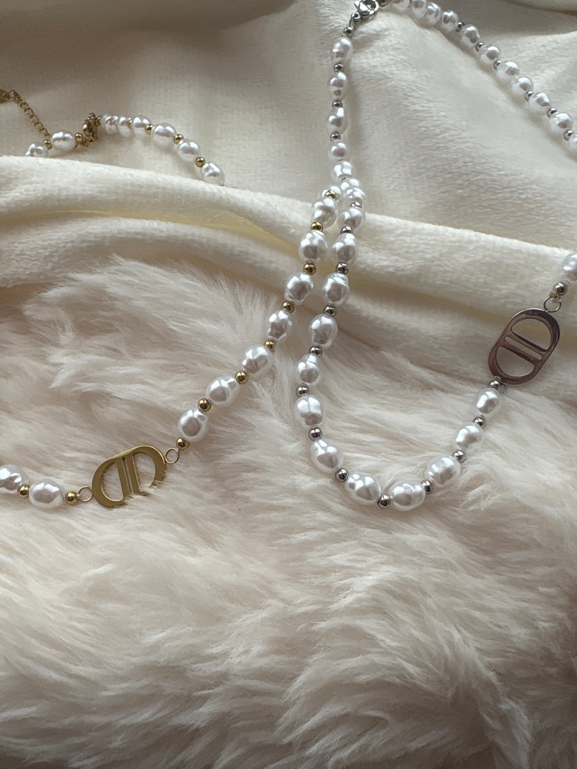 Ce collier en perles blanches est sublimé par un pendentif logo tendance au centre, pour un style chic et moderne. Composé de perles irrégulières et de billes métalliques, il apporte une touche sophistiquée à toutes tes tenues, du quotidien aux occasions spéciales.